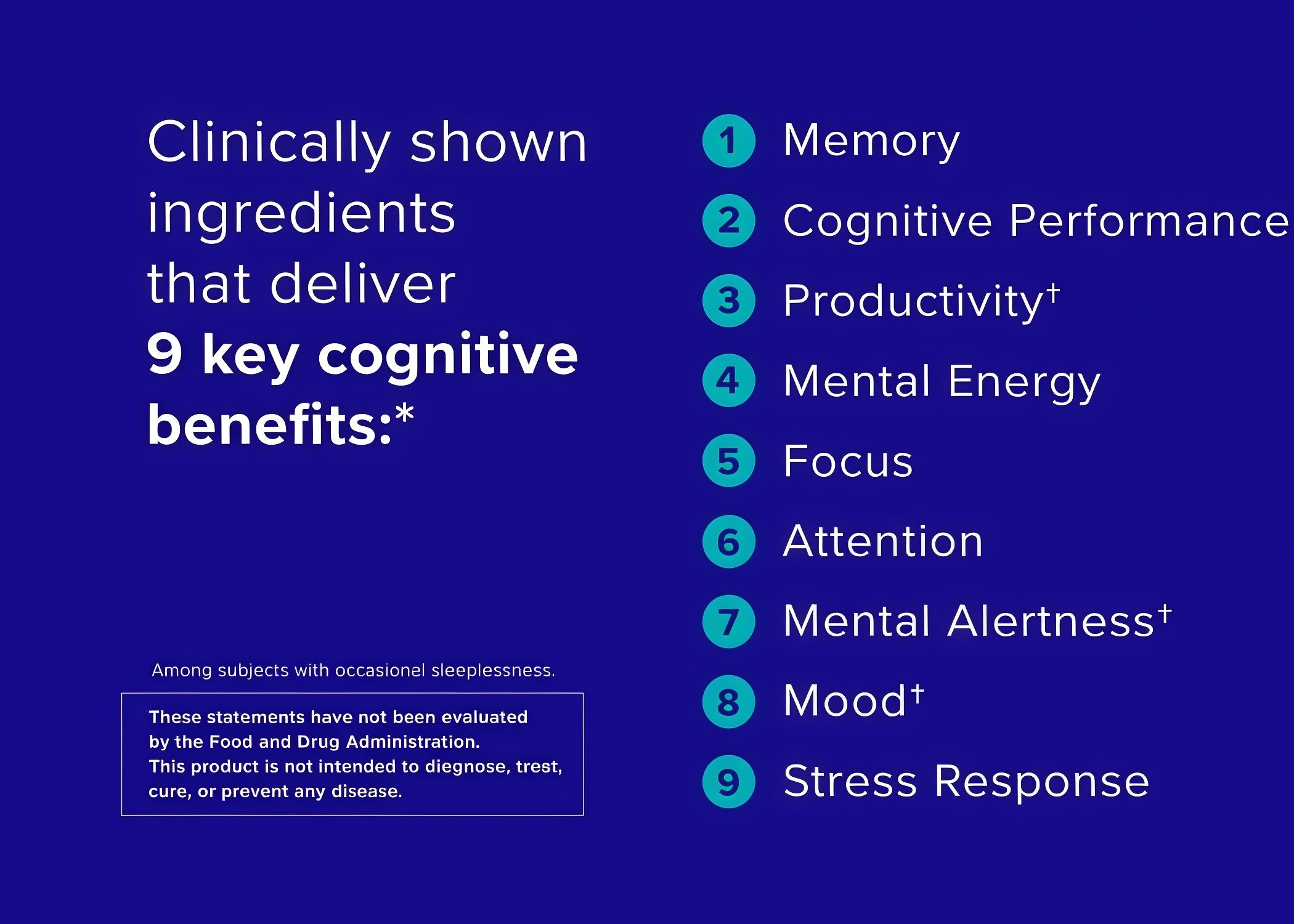 These ingredients are clinically shown to improve attention, memory & mental alertness.