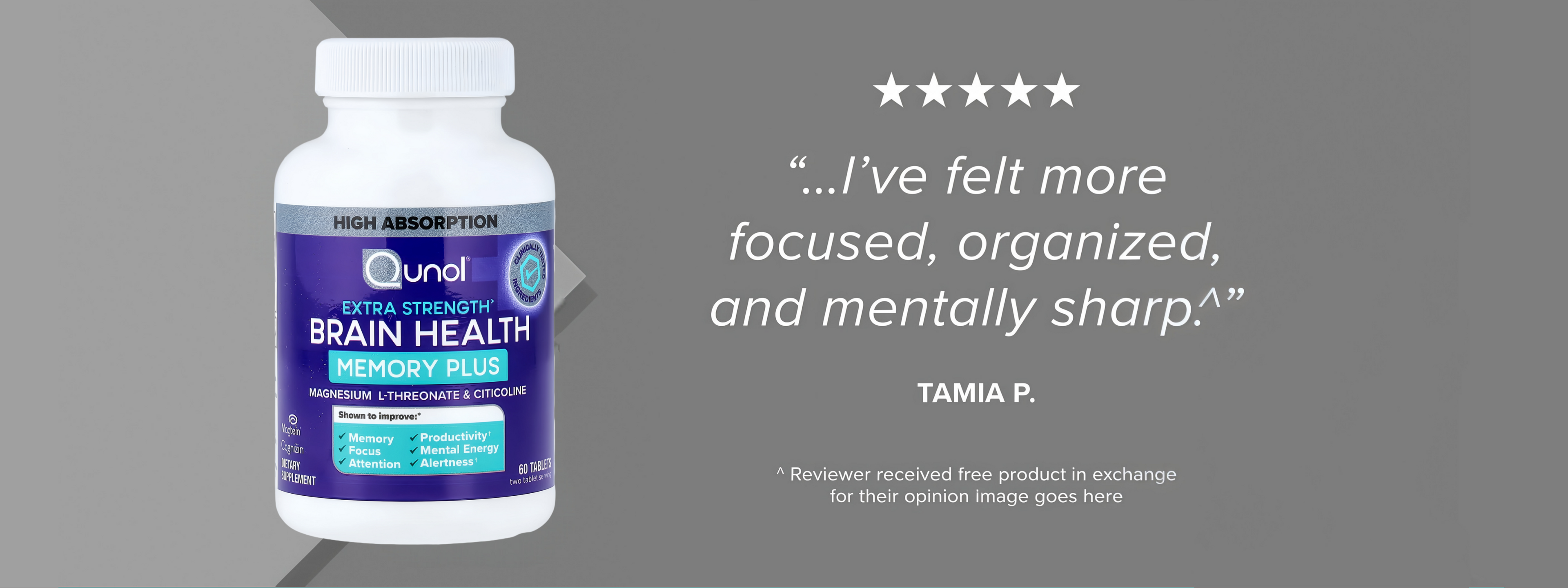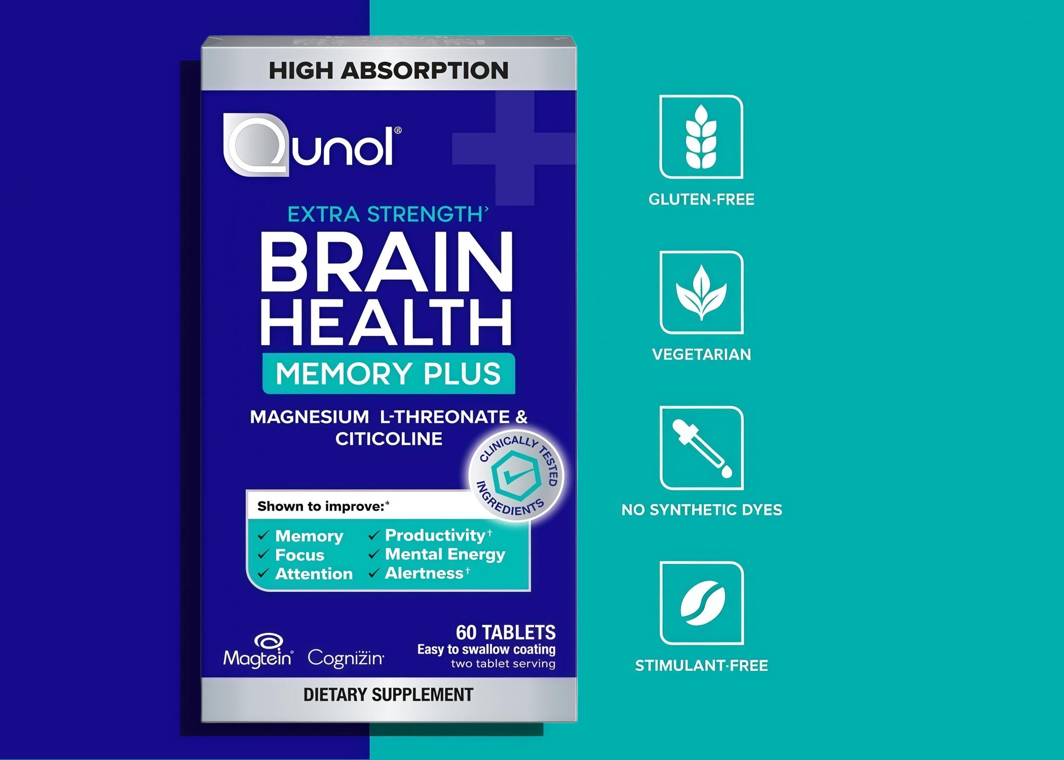 Qunol Brain Health is the first and only dual-action tablet to combine two powerful, clinically tested, high-absorption ingredients: Magnesium L-Threonate and Citicoline.